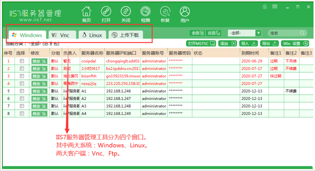 IIS7服务器管理工具的VNC功能可以说是使用起来十分方便。它可以一键导出或导入,一键批量打开VNC,一键批量关闭VNC,服务器到期提醒,支持多台VNC 自定义备注,自定义分组,支持批量操作。