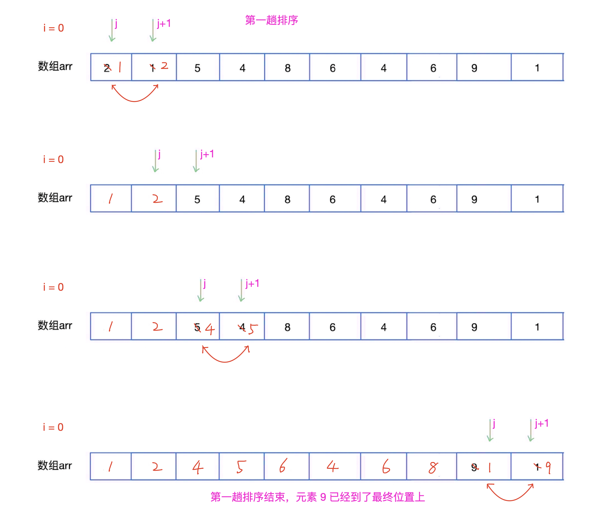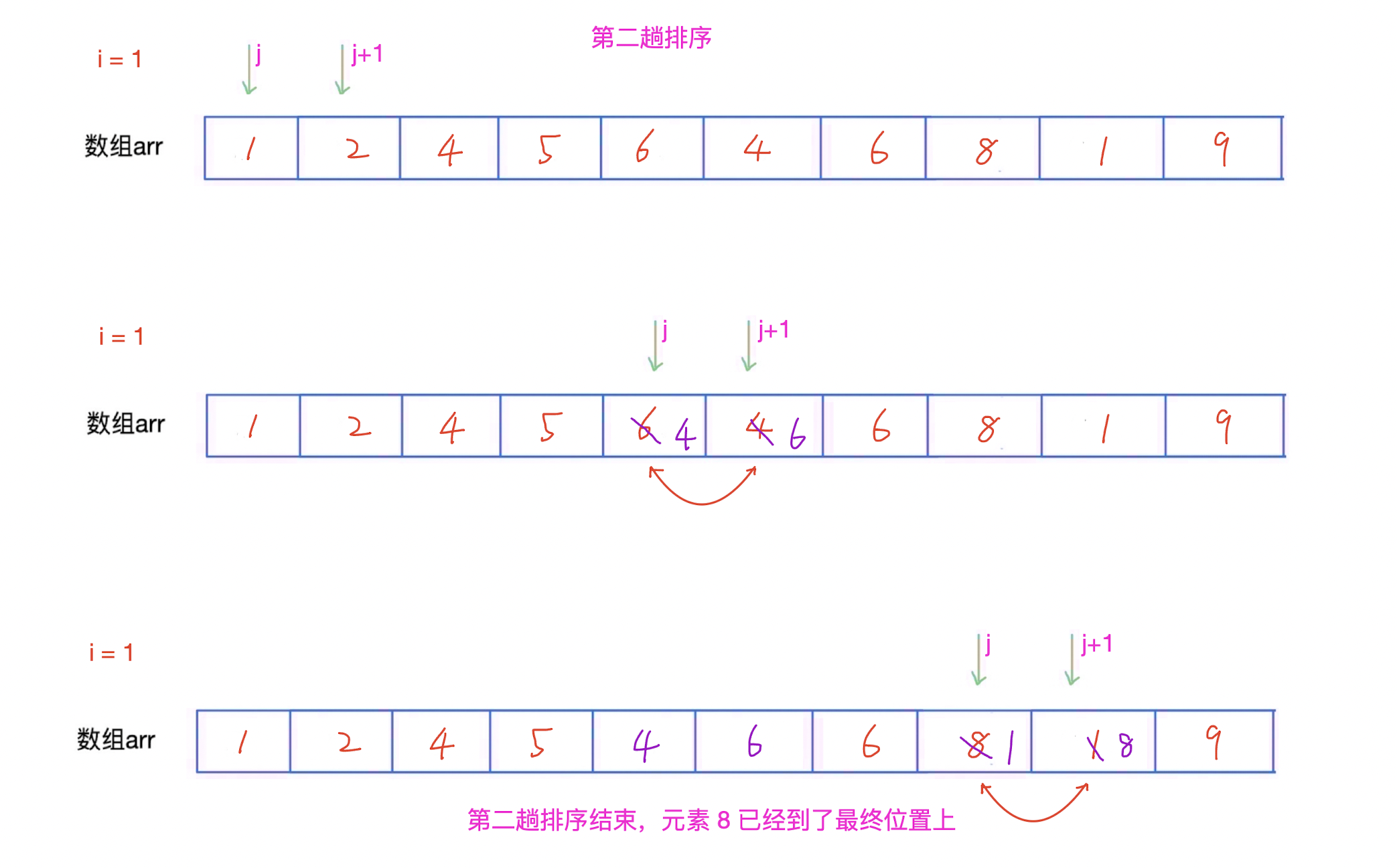 arr[j + 1] < arr[j]才交换)。