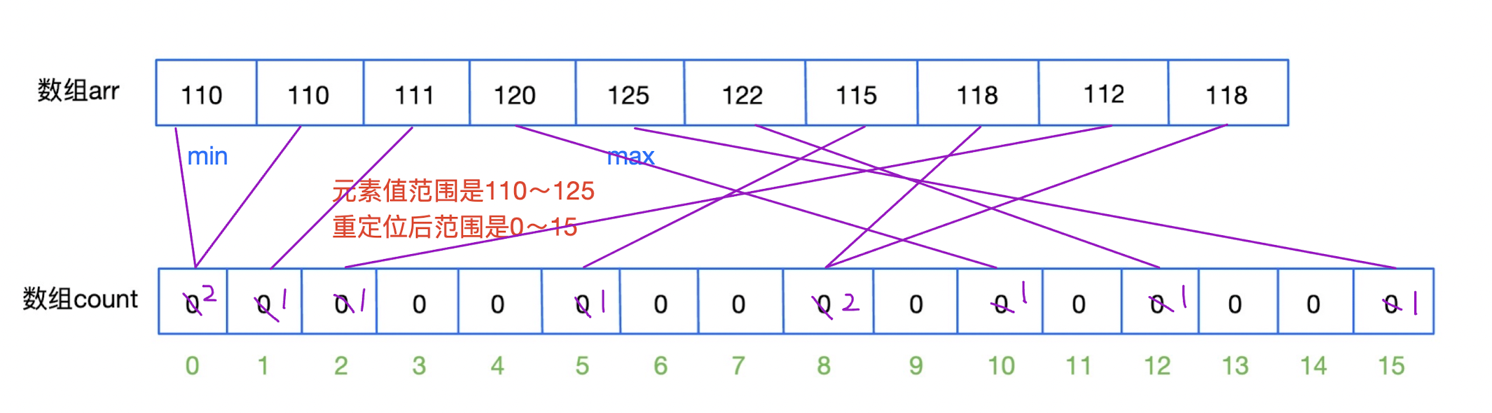 min和max记录原数组的最小值和最大值,确定临时数组的长度(max-min+1),然后对临时数组count进行初始化,接下来就是把原数组里的元素重定位为临时数组的下标(元素值减原数组的最小值),并对此下标对应的元素+1,一直到遍历完原数组。 -