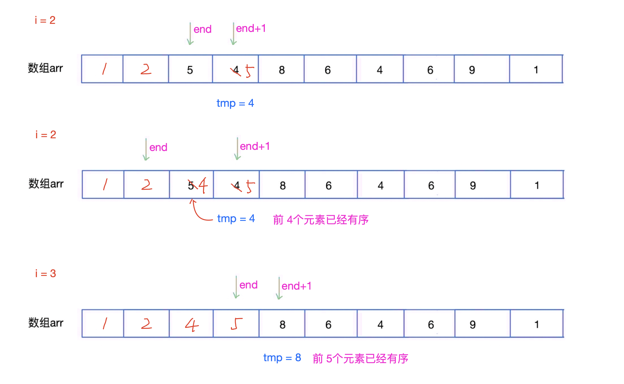 tmp中,在已经排序的元素序列中从后向前扫描(end--),如果该元素(已排序)大于新元素,将该元素移到下一位置,如果该元素小于等于新元素,则直接在这个元素的后面把新元素放进来。