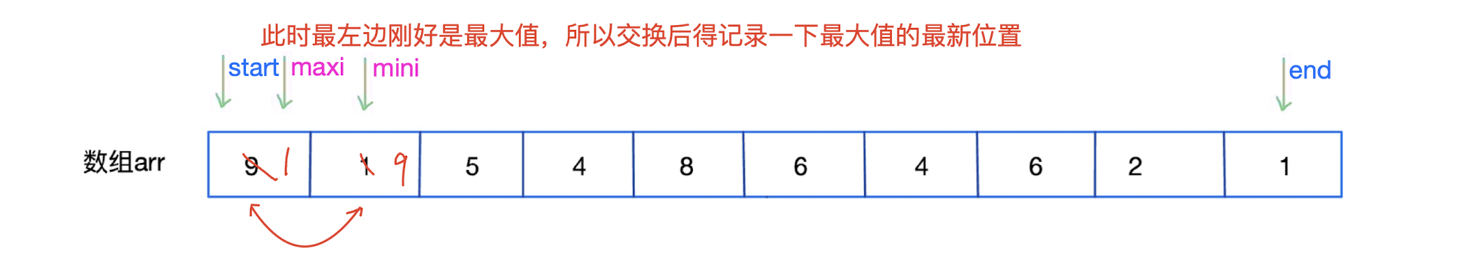 mini和maxi分别记录当前未排序的最小值下标和最大值下标在未排序的序列中找出最小值和最大值,然后分别交换到当前未排序的起始位置和末尾位置。需要注意的是:如果当前未排序的序列中,最大值刚好在未排序序列的起始位置,那么就需要记录好这个最大值与当前未排序的序列中的最小值交换后的位置,不记录的话,那么当前maxi指向的值不一定是最大值!//选择排序 void SelectSort(int *arr, int n) { int mini = 0; int maxi = 0; int start = 0; int end = n - 1; while (start < end) { for (int i = start + 1; i <= end; ++i) { if (arr[i] > arr[maxi]) { maxi = i; } if (arr[i] < arr[mini]) { mini = i; } } Swap(&arr[mini], &arr[start]); //注意此时如果start刚好是最大值的话,就会把最大值换走了,也就是本来最大值在 0 位置,交换后换到其他位置了,所以判断一下 if (start == maxi) { maxi = mini;//找到最大值的下标 } Swap(&arr[maxi], &arr[end]); //向中间靠拢 ++start; --end; } } -
