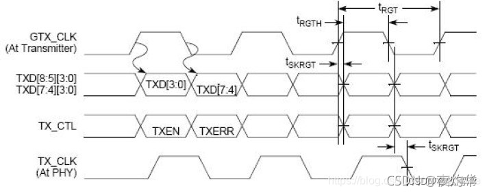 虽然RGMII信号线减半,但TXC/RXC时钟仍为125Mhz,为了达到1000Mbit的传输速率,TXD/RXD信号线在时钟上升沿发送接收GMII接口中的TXD[3:0]/RXD[3:0],在时钟下降沿发送接收TXD[7:4]/RXD[7:4],并且信号TX_CTL反应了TX_EN和TX_ER状态,即在TXC上升沿发送TX_EN,下降沿发送TX_ER,同样的道理试用于RX_CTL,下图为发送接收的时序: