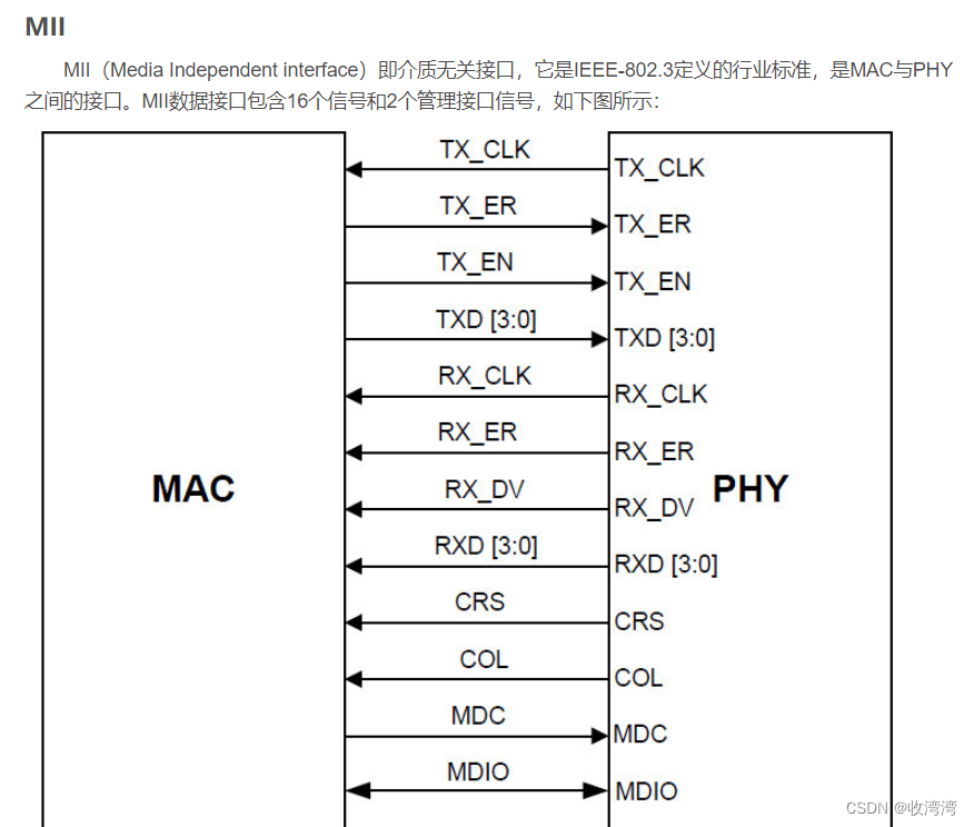 7个接收接口:时钟、接收有效判断、接收错误判断、四个接受位。PHY --- MAC