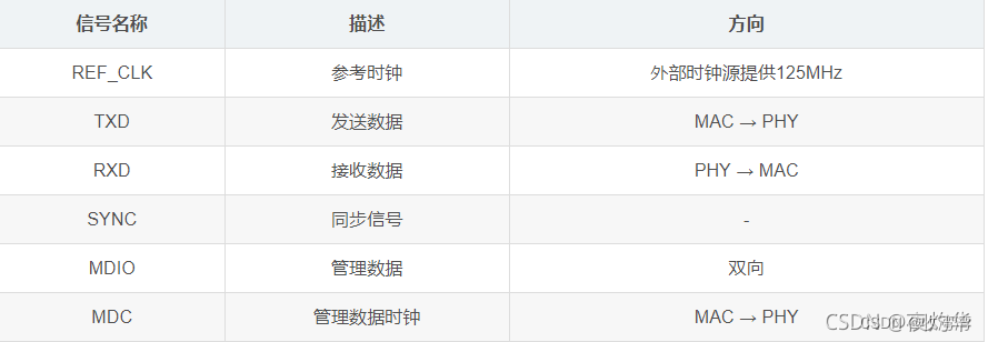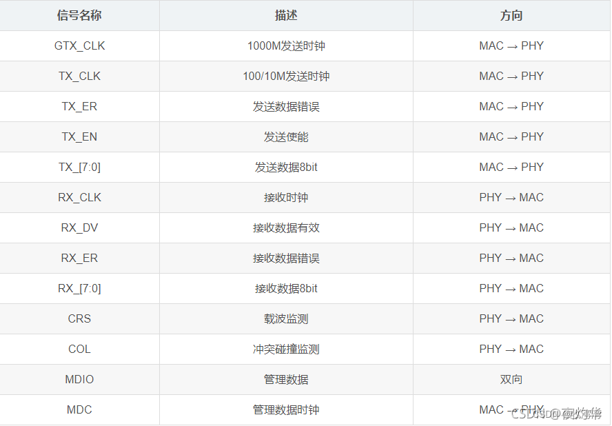 7个发送接口: 时钟(PHY ---- > MAC)、发送错误检测、使能、四个信号传输位 MAC --- PHY
