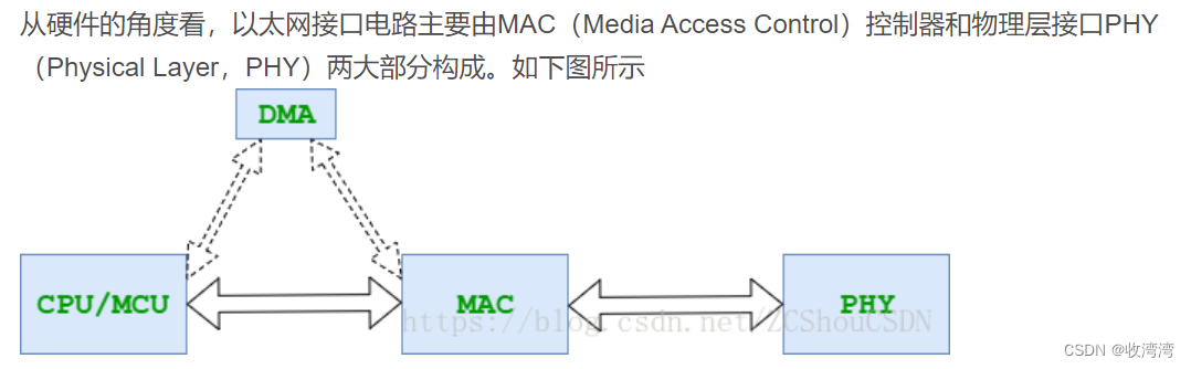 PHY与MAC进行通信,MAC再跟DMA和CPU/MCU进行通信,如下图所示。