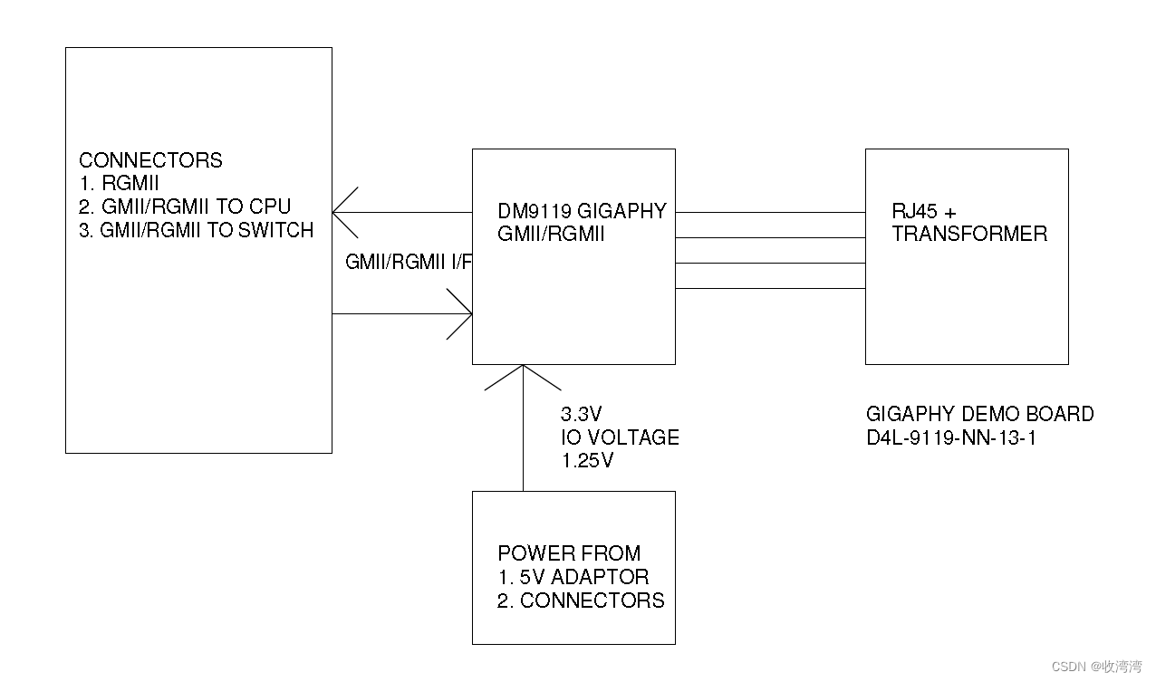 PHY芯片有 SI、MII、GMII 三种接口,配合时钟(晶振)进行信号传输。