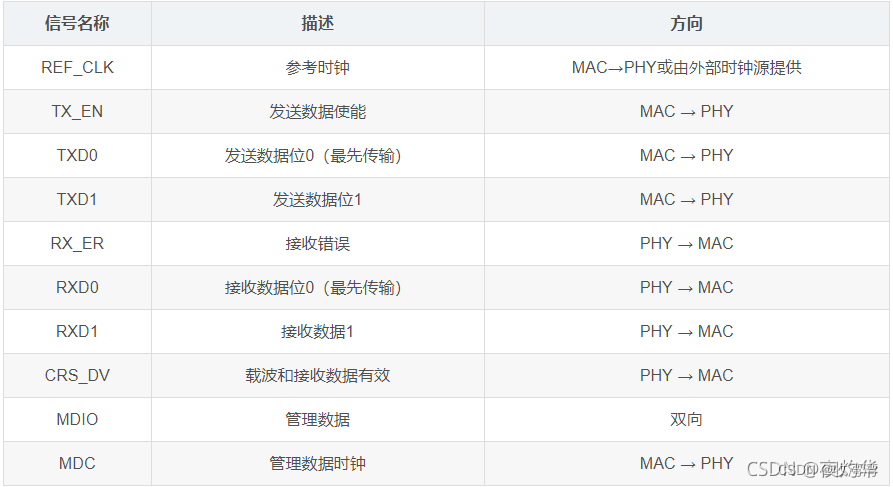 RMII(Reduced Media Independant Interface),精简MII接口,节省了一半的数据线。RMII收发使用2位数据进行传输,收发时钟均采用50MHz时钟源。信号定义如下: