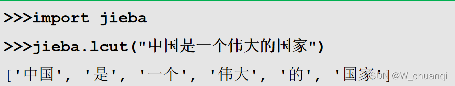 >>> jieba.lcut( " 中国是一个伟大的国家 " )