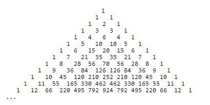 a[i][j]=a[i-1][j-1]+a[i-1][j]; //每个数等于上一行的二个数之和
