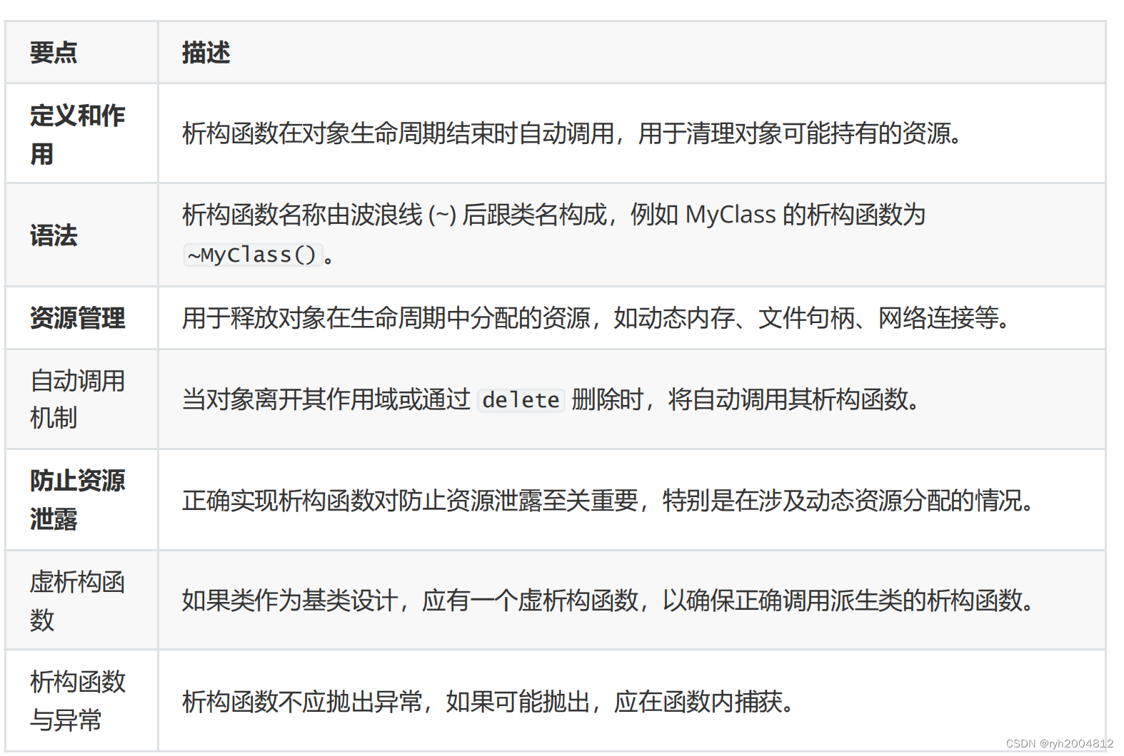 以下是关于 C++ 中析构函数需要了解的十个要点的表格: