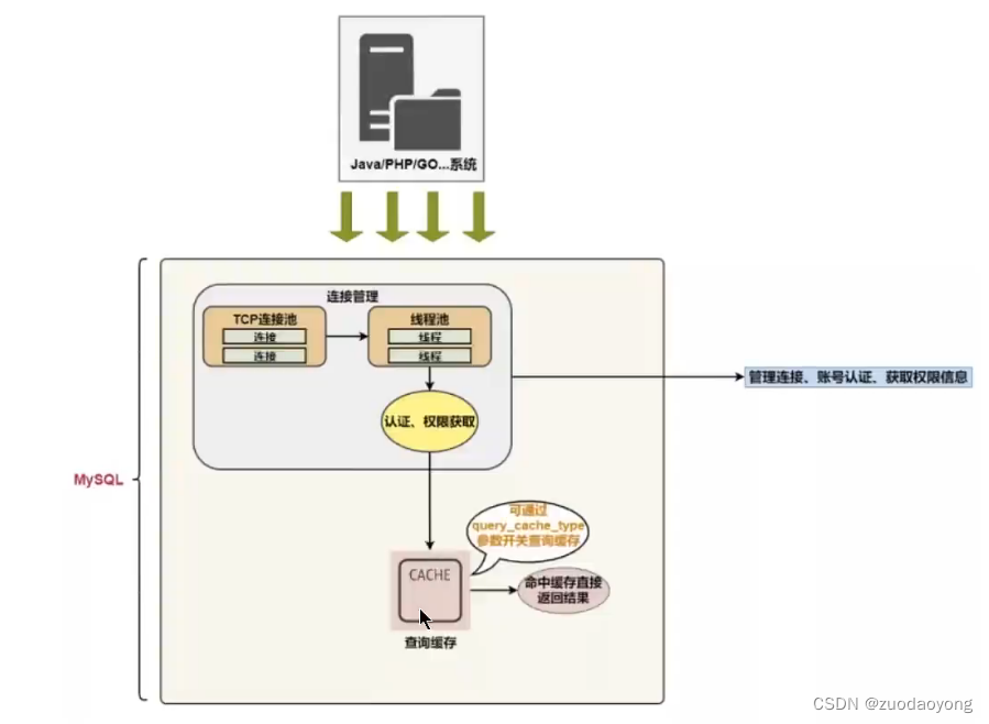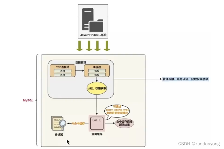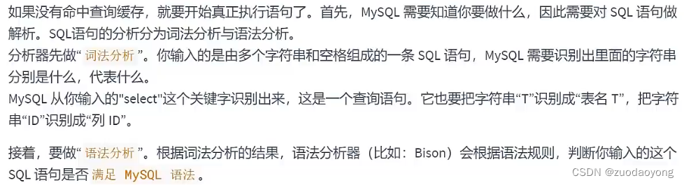 server如果在查询缓存中发现了这条SQL语句,就会直接结果返回给客户端,如果没有,进入到解析器阶段,查询缓存效率一般不高,MYSQL8.0之后抛弃了这个功能