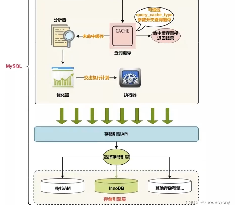 在执行前判断用户是否有权限,如果没有,返回权限错误。如果有权限,则打开表继续执行,打开表的时候执行器就会根据表的引擎定义,调用存储引擎API对表进行读写,存储引擎API只是抽象接口,下面还有个存储引擎层,具体实现需要看存储引擎层