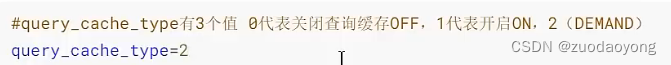 一般建议在静态表(很少更新的表,比如系统配置表,字典表)使用缓存查询,MYSQL提供了按需设置的方式。在my.cnf文件中query_cache_type设置为DEMANO,代表当sql语句中有SQL_CACHE关键词时才有缓存。