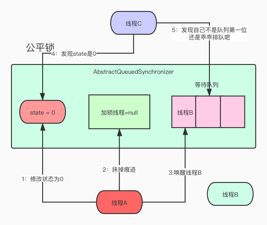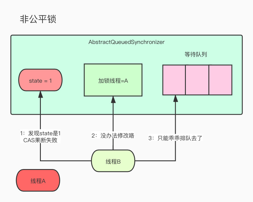 线程A暖男来了,持有没多久就释放了,改掉了所有的状态就去唤醒线程B了,这个时候线程C进来了,但是他先判断了下state发现是0,以为有戏,然后去看了看队列,发现前面有人了,作为新时代的良好市民,果断排队去了。
