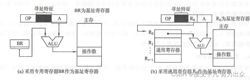 基址寻址:将CPU中基址寄存器(BR)的内容加上指令格式中的形式地址A,而形成操作数的有效地址,即EA=(BR)+A;其中基址寄存器既可采用专用寄存器,又可采用通用寄存器