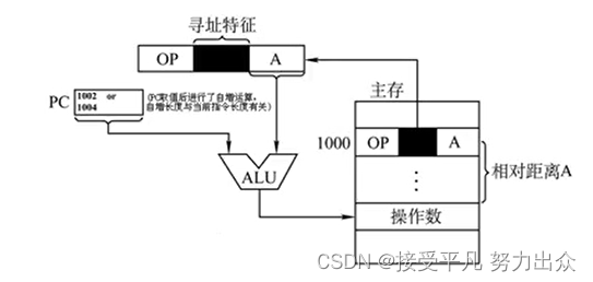 相对寻址:把程序计数器PC的内容加上指令格式中的形式地址A而形成操作数的有效地址,即EA=(PC)+A,其中A是相对于PC所指地址的位移量,可正可负,补码表示.