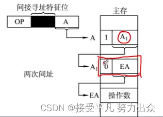 间接寻址:指令的地址字段给出的形式地址不是操作数的真正地址,而是操作数有效地址所在的存储单元的地址,也就是操作数地址的地址,即EA=(A);