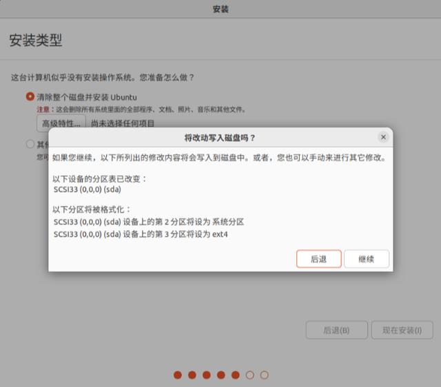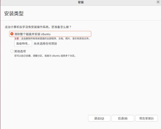 进行全新安装,直接选择【清除整个磁盘并安装 Ubuntu】,再点击右下方【现在安装】按钮