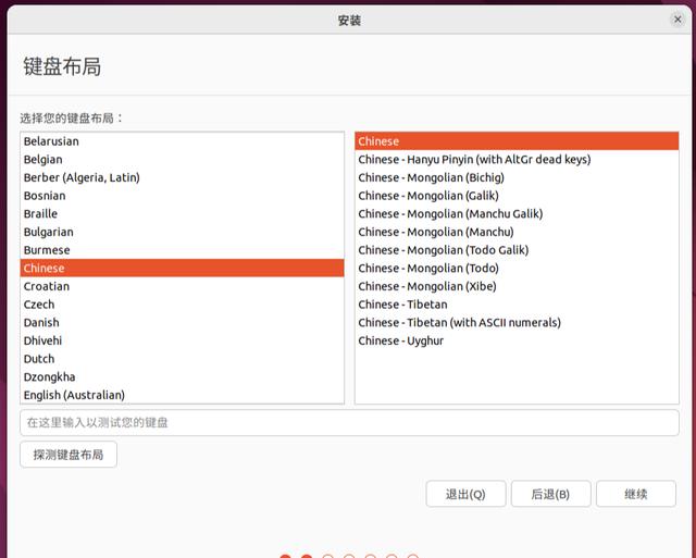键盘布局这里已经默认检测出了我们使用的是【Chinese】键盘布局,如果你的检测出来不正确,可以点击【探测键盘布局】进行重新选择,或者直接手动指定。选择好后点击【继续】进入下一步。