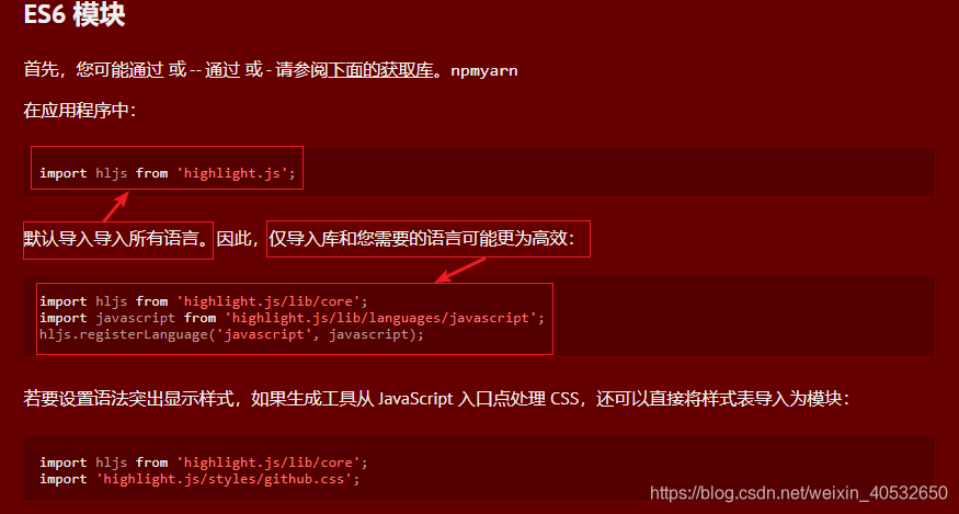 3.问题:看了参考的文章,静态数据渲染没有问题,但我在项目中动态加载数据,样式始终不出来,用了highlightBlock,highlightAuto依旧不行;在官网找到了原因,是我引入对象不匹配导致的,