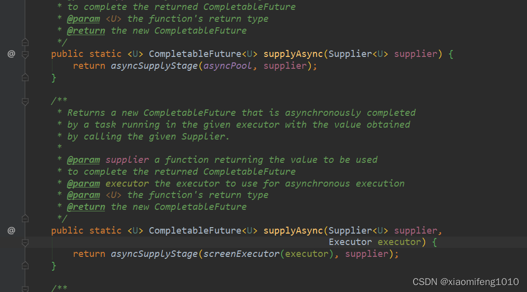 所以如果你要在异步执行的线程方法中获取用户身份信息,需要传递安全上下文,就需要使用下边截图中CompletableFuture源码中的第二个重载方法,需要传入线程池,并且是被DelegatingSecurityContextExecutorService修饰的线程池。如果异步方法中不需要获取用户身份信息,则可以使用第一个重载方法,直接使用默认线程池就可以。