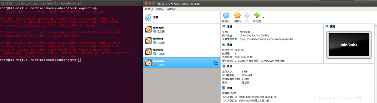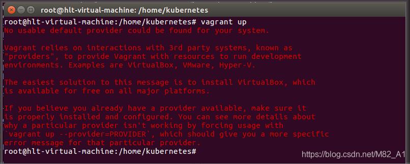 执行vagrant up报错的解决方法本来是打算利用Vagrant和Virtualbox部署本地的Kubernetes集群,编写完Vagrantfile后执行vagrant up却报了一堆错。报错信息:No usable default provider could be found...
