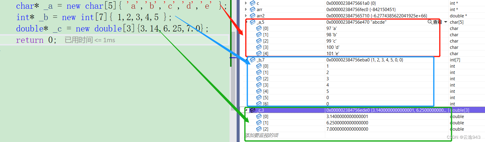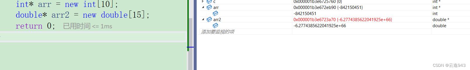 代码解析:动态开辟一块包含10个整型数据的堆空间;动态开辟一块包含15个浮点型数据的堆空间。这些开辟的数据仍都是随机值。