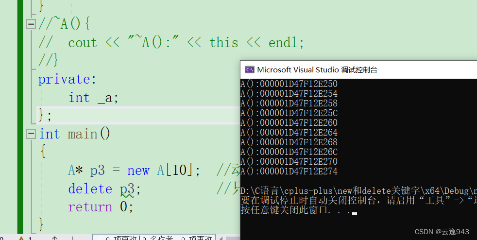 当执行new开辟时,编译器申请了10个空间,同时也会调用10个构造函数,delete p3后,因为析构函数是自己写的,编译器接收到指令只调用一次析构,而有10个构造就得调用10次析构,所以编译器不知道该怎么办了,会报错!造成内存泄漏