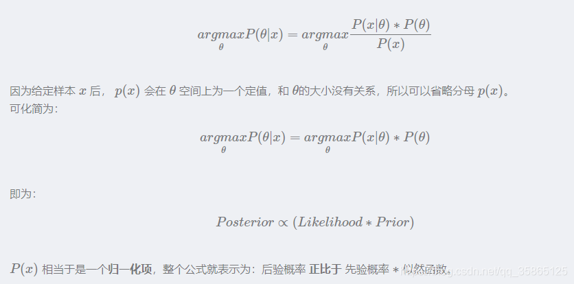 即,最大后验估计优化的是P(x|θ)* P(θ),即多加了一个先验限制。