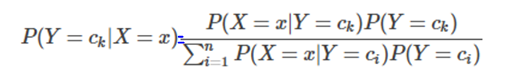 从而,我们可以计算出任一样本x属于类别ck的概率,选择其中概率最大者便可作为其分类的类标。上式中,对于每个样本的计算都有相同的分母,因此可以略去,化简为: