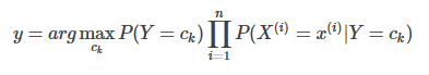 其中,P( X(i)=x(i)|Y=ck ) = (类标签为ck的样本中 第i个特征值为x(i)的样本个数) / (分类标签为ck的样本个数),可以通过样本直接统计出来。