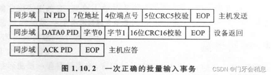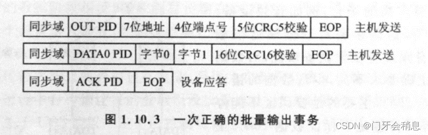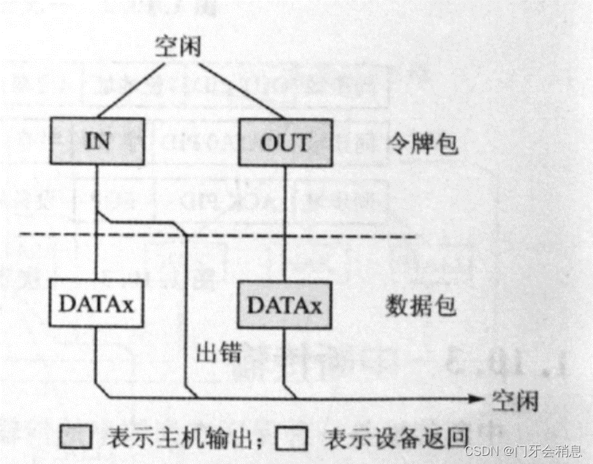 USB中数据传输的基本单位是包,必须按照一定的关系将这些包组织成事务才能传输数据。事务通常由令牌包、数据包、握手包组成。