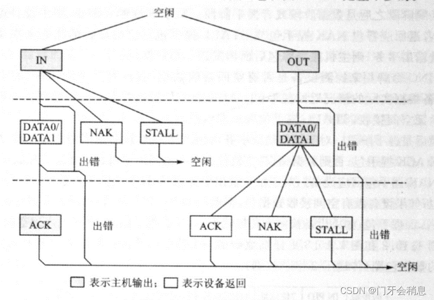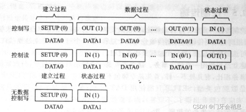 USB中的四种传输:批量传输、等时传输(音视频数据)、中断传输(HID设备)、控制传输(用于获取描述符),其中批量传输、中断传输、等时传输都是一个事务;控制传输包括三个过程(建立过程、状态过程分别是一个事务,数据过程可能包含多个事务)。