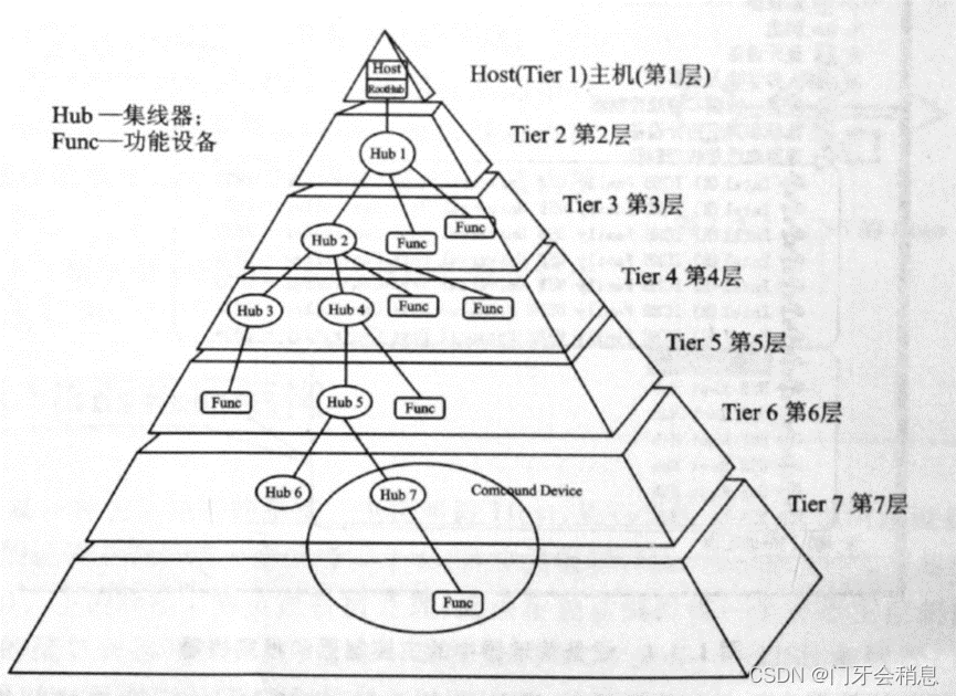 USB拓扑:塔顶为USB主控制器和根集线器,下面接USB集线器,USB集线器将一个USB口扩展为多个USB口,多个USB口又可以通过集线器扩展出更多的接口。
