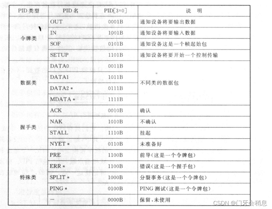 包标识符PID:它总共有8位,USB协议使用的只有4位(PID0-PID3),另外4位(PID4-PID7)是PID0-PID3取反用来校验PID。