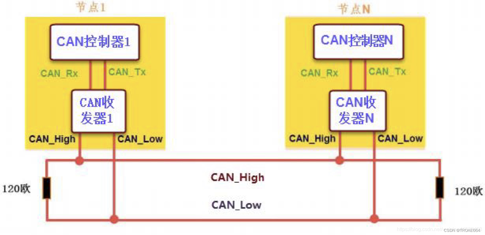 总线上,只要有一个节点输出显性,则总线上为显性电平;只有所有节点都是隐性电平,总线才为隐性电平