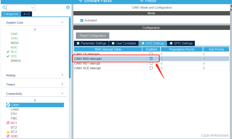 一般通信都会打开接收中断,在这里打开CAN1 RX0的中断,优先级可以通过NVIC进行更改。