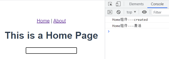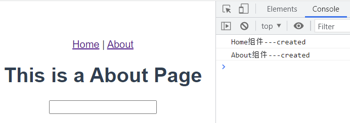 这里有两个组件,Home和About,我们使用钩子函数来显示每个组件的创建和销毁