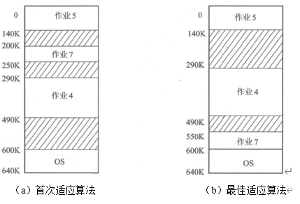 使用首次适应算法和最佳适应算法进行上述内存的分配和回收后,内存的实际使用情况分别如图(a)和(b)所示。