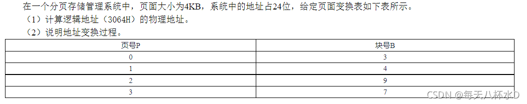 (1)逻辑地址3064H=0011 0000 0110 0100B,则p=0011B=3D,页内地址w=0000 0110 0100B=100D,查页表得知3号页存在7号块,因此物理地址为: