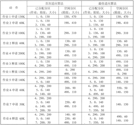 首次适应算法将空闲区按起始地址递增的次序排序,而最佳适应算法则将空闲区按分区大小递增的次序排序。在分配时,它们都是从开始顺序查找,直至找到一个足够大的空闲分区为止,然后按作业大小从该分区中划出一块内存空间分配给请求者,余下的分区(如果有的话)仍按上述原则留在空闲分区链中;在释放时,则需分别按地址递增或大小递增的次序将空闲分区插入空闲分区表(链),并合并空闲分区。表5-2-6给出了使用这两种算法进行上述内存分配和回收的具体过程。