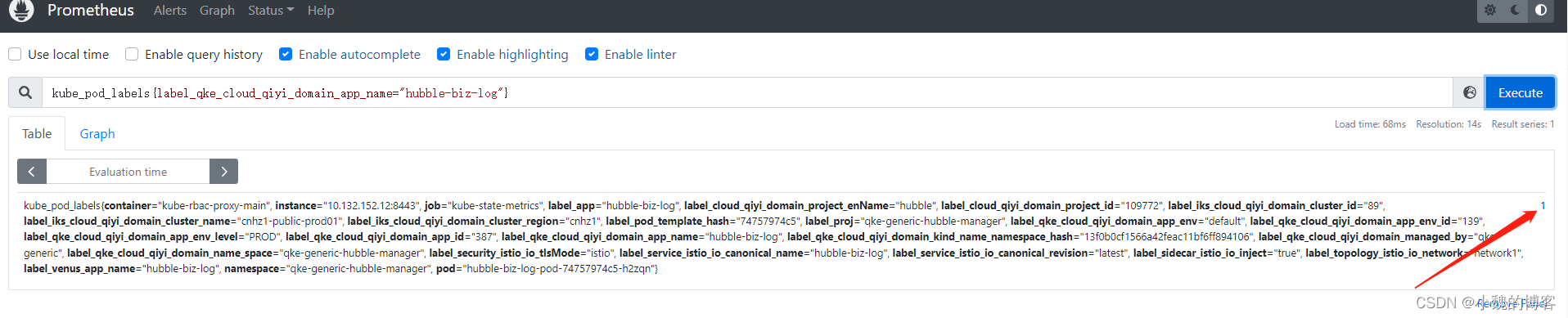 因为kube_pod_labels{label_qke_cloud_qiyi_domain_app_name=\"hubble-biz-log\"}的结果值始终是1,任何数乘以1都是不变的