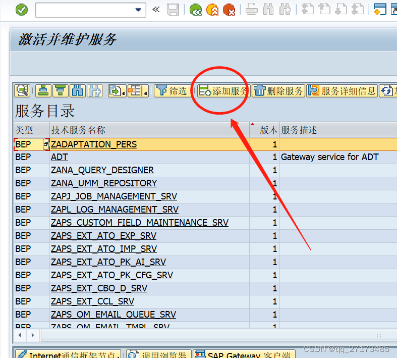 然后返回上一页面,找到自己的服务ZTEST_SRV服务,选择,并点击“添加所选服务”。