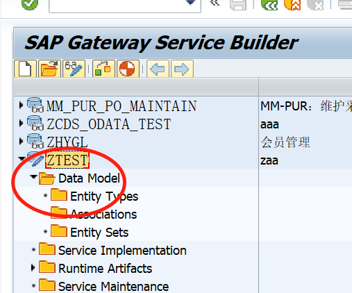 登陆SAP GUI 后,使用事务码SEGW,创建一个SAP Gateway Service Builder,在此定义为了ZTEST.
