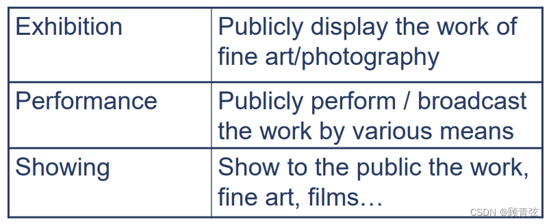 - Non-owners have to buy the work or acquire the permission to use the work against payment to owner (assignment and licence) 非所有者必须购买作品或获得使用作品的许可,并向所有者付款 (转让和许可证)