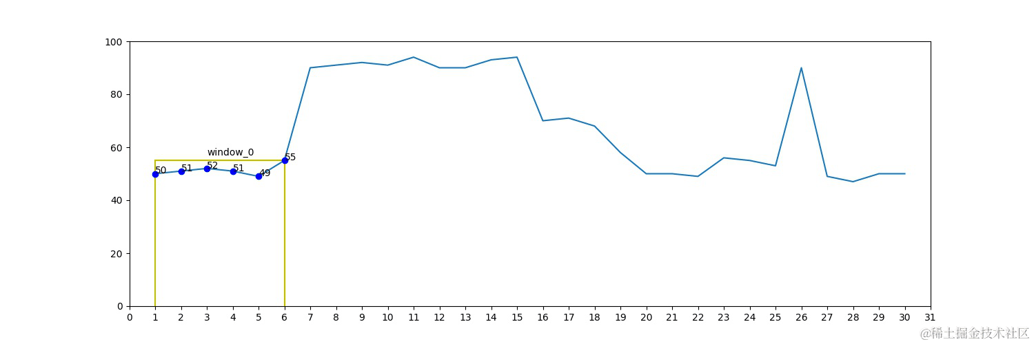 下图是动态展示滑动窗口的示意图,按照黄色线固定窗口进行移动,窗口内会出现各种数值点,对窗口数字进行统计: