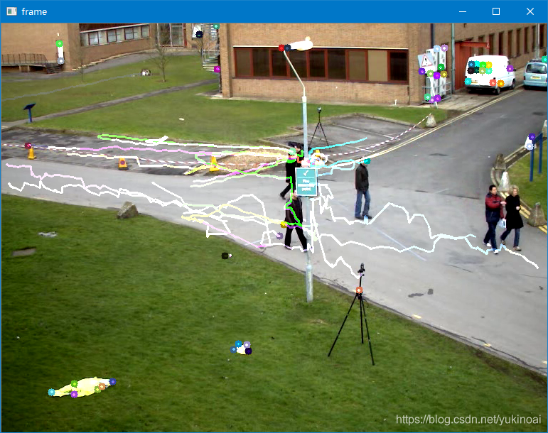 上述所有过程都被OpenCV打包成了一个函数:cv2.calcOpticalFlowPyrLK()。现在我们使用这个函数创建一个小程序来跟踪视频中的一些点。要跟踪那些点 呢?我们使用函数 cv2.goodFeatureToTrack() 来确定要跟踪的点。我们首先在视频的第一帧图像中检测一些 Shi-Tomasi 角点,然后我们使用 LucasKanade算法迭代跟踪这些角点。我们要给函数cv2.calcOpticlaFlowPyrLK()传入前一帧图像和其中的点,以及下一帧图像。函数将返回带有状态数的点, 如果状态数是 1,那说明在下一帧图像中找到了这个点(上一帧中角点),如果 状态数是 0,就说明没有在下一帧图像中找到这个点。我们再把这些点作为参 数传给函数,如此迭代下去实现跟踪。