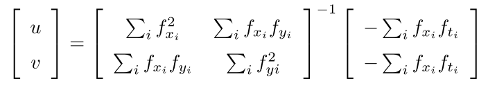 现在我们要使用第二条假设,邻域内的所有点都有相似的运动。LucasKanade 法就是利用一个 3x3 邻域中的 9 个点具有相同运动的这一点。这样 我们就可以找到这 9 个点的光流方程,用它们组成一个具有两个未知数 9 个等 式的方程组,这是一个约束条件过多的方程组。一个好的解决方法就是使用最 小二乘拟合。下面就是求解结果:
