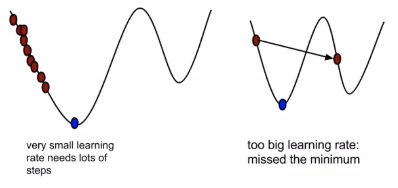 α在梯度下降算法中被称作为 学习率 或者 步长 ,意味着我们可以通过α来控制每一步走的距离,控制参数不要走太快,错过了使损失函数取最小值的点。同时也要保证不要走的太慢,导致太阳下山了,还没有走到山下。所以α的选择在梯度下降法中往往是很重要的!α不能太大也不能太小,太小的话,可能导致迟迟走不到最低点,太大的话,会导致错过最低点!