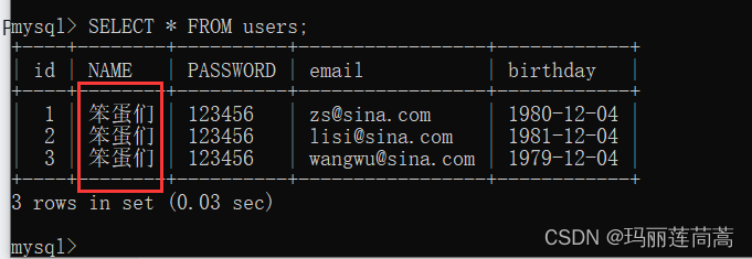 id =3 姓名 =wangwu 密码 =123456 邮箱 =wangwu@sina.com 生日 =1979-12-04